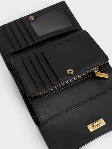 Keep all your cards, cash, and other small items organised and safe with our Huxley front flap wallet. In versatile black, this wallet is an absolute style essential that will complement your outfit and other accessories effortlessly. Featuring a sleek curved flap and knotted gold-toned metallic accent, this sophisticated and sleek wallet has no shortage of design elements for you to admire.