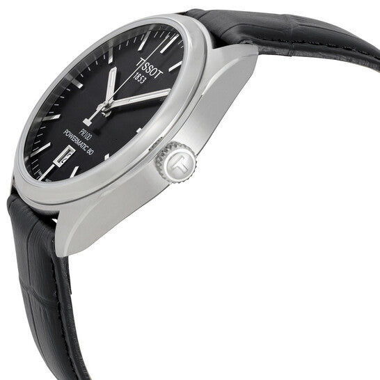Stainless steel case with a black leather strap. Fixed stainless steel bezel. Black dial with luminous silver-tone hands and index hour markers. Minute markers around the outer rim. Dial Type: Analog. Luminescent hands. Date display at the 6 o'clock position. Tissot calibre Powermatic 80 (C07.111) automatic movement, based upon ETA 2824-2, containing 23 Jewels, bitting at 21600 vph, and has a power reserve of approximately 80 hours.